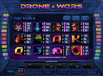 Игровой аппарат Drone Wars, созданный специалистами Microgaming, посвящен популярному научно-фантастическому жанру. Вместо первоклассного трехмерного дизайна разработчики сделали ставку на кинематографию 1950-х годов. В результате получился эффектный микс футуризма и ретро-эстетики. В азартной игре действие происходит в далеком будущем, но правила выдержаны в классическом стиле.